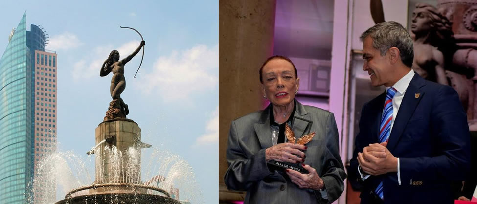 El Jefe de Gobierno de la Ciudad de México, Miguel Ángel Mancera, acompañado del secretario de Desarrollo Social , José Ramón Amieva, entregó las “Alas de la Ciudad” a Helvia Díaz Serrano, por haber posado en 1942 como modelo de la escultura de La Diana Cazadora. A sus 95 años, la también viuda de Jorge Díaz Serrano, el que fuera director de PEMEX durante el sexenio de José López Portillo, recibió dicho galardón acompañada de familiares y amigos.