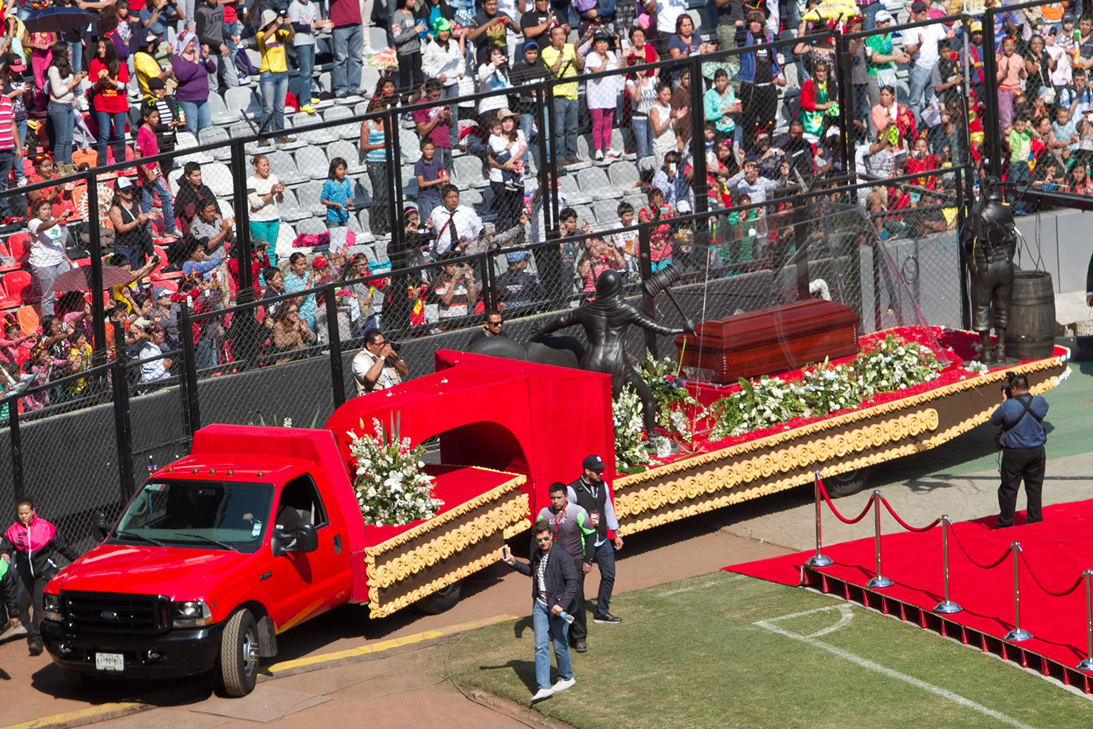 El cuerpo de Chespirito fue trasladado en un camión que mostraba el ataúd acompañado de una escultura del Chapulín Colorado y otra del Chavo del Ocho / FOTO: excelsior.com