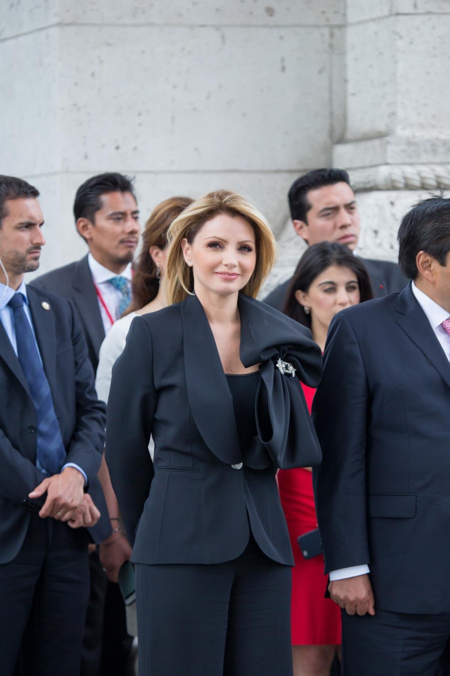 ← → Angélica a la “Máxima”.Este saco con un gran lazo, salvó el outfit de Rivera la tarde del martes pasado en Francia.