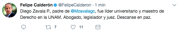 La mañana del domingo 9 de julio se registró el deceso de Diego Zavala Pérez, padre de la aspirante a la presidencia de México en 2018 Margarita Zavala Gómez del Campo (@Mzavalagc).